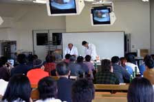 但馬屋老舗は本店の歴史ある木造建築のイメージを活かしつつ外観は白壁造りの一見由緒ある宿を思わせるような工場でしたが、中に入ると近代的な設備が整っていて、そのギャップに驚かされました。その他にもいくつかの関連施設があり板井社長と専務の案内により丁寧に説明をしていただきながらじっくりと見学しました。また、くじゅう高原の瀬の本に販売店を出店したとのことで、そちらにも寄ってみましたが素晴らしい環境の中に温泉施設が完備されたCOCO VILLAGEというリゾート施設があり、その中で洋菓子屋やレストラン等と一緒に、お馴染みの「荒城の月」や「三笠野」など銘菓が並ぶ瀬の本店が出店されていて、交代で出勤するという従業員の方が感じの良い対応をしていました。