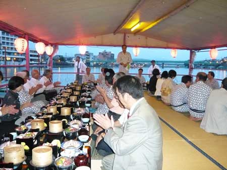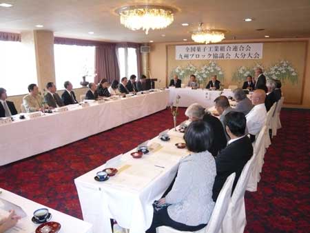 8月21日(木)に、日田市の亀山亭ホテルにて平成20年度 全国菓子工業組合連合会 九州ブロック協議会が開催されました。九州各県持ち回りで毎年7月に行われている恒例行事でしたが、今年は姫路菓子博の褒賞伝達式等もあり、開催県である大分県のわがままを聞いてもらう形で盆明けの日田市開催となりました。九州各県の代表の他に、東京から全菓連の矢部専務が近況報告のために、兵庫県からは姫路菓子博2008の終了報告のために実行委員の3名の方が遠路はるばるお越し下さいました。本会議終了後は19時より屋形船での懇親会を行い、三隈川に浮かぶ船の上で、食事をしながら更に親睦を深めました。幸い天候も気候も程よく、たいまつを掲げた鵜飼い舟の演出も手伝って、楽しい一時を過ごせたのではないでしょうか。