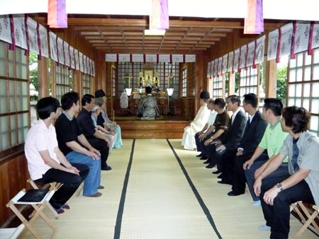 毎年7月12日は、松栄神社(大分市荷揚町)にて、大分市菓子組合の献菓祭が執り行なわれています。約40年前から続くこの行事は、組合員が持ち寄った銘菓を神前にお供えし、業界の繁栄等を祈願する祭儀で、今年も12日の土曜日につつがなく行われました。献菓祭のあとは会場を移動し、宮司より菓子のあゆみや献菓祭についてのお話を聞いた後、直会(なおらい)を行いました。