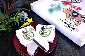 白いそぎ種に北海道大納言小豆を厳選し、餅粉ねり牛皮にした物に餡をつつみそぎ種を上下にはさみ、みじ粉をつけ仕上げたものです。風味良くお茶と良く合います。一度味見して下さい。