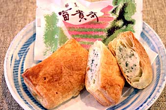 地元の青ノリが入った自家炊きの白餡をパイ生地で包んだ和洋折衷菓子。毎日手作りして、焼きたてを提供させて頂いております。