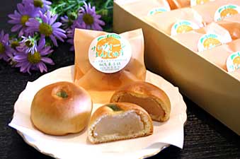 サンクイーンを一度マーマレードに仕上げ、白餡の中に混ぜて焼成したまんじゅうです。ミカンの香りとまんじゅうがうまく混ぜ合わさったまんじゅうです。