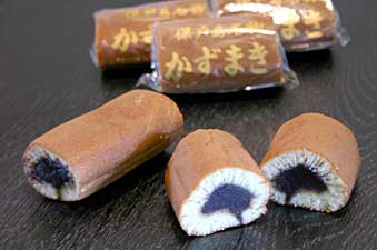 卵、砂糖、小麦粉を混ぜて、一文字窯で焼いて、その上に小豆こしあんをのせて巻いたお菓子です