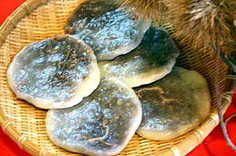 昔から伝えられている素朴なもち菓子。もち米と小麦粉で作った皮、たっぷりの小豆アンを包んだものをせいろで蒸したもの。できたての熱いものより冷えたものもたいへん美味しいです。